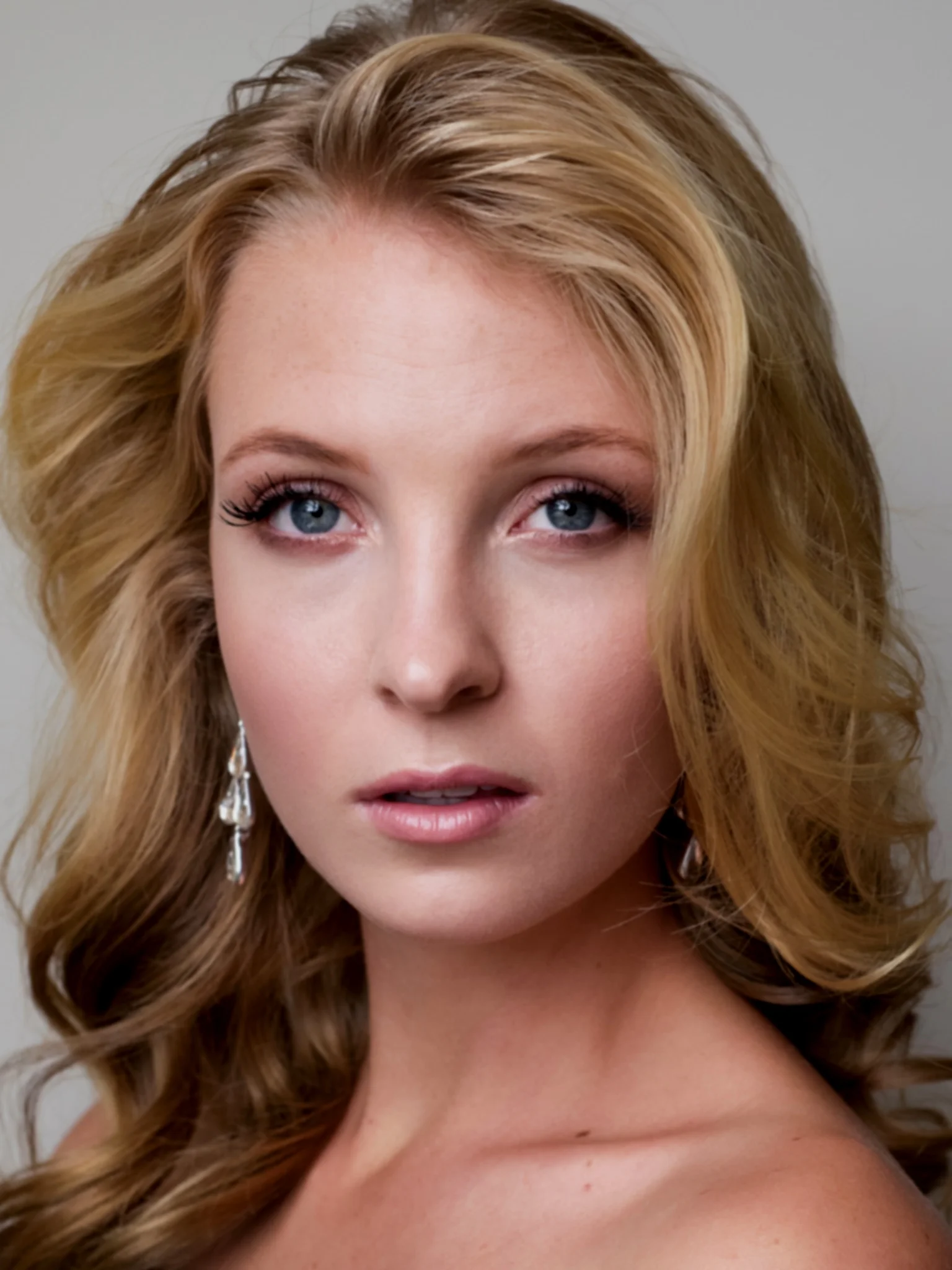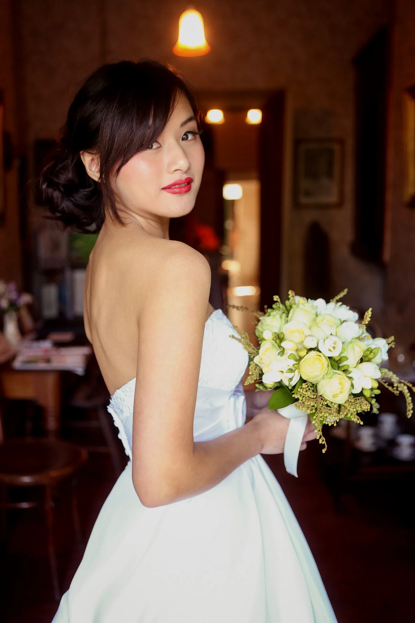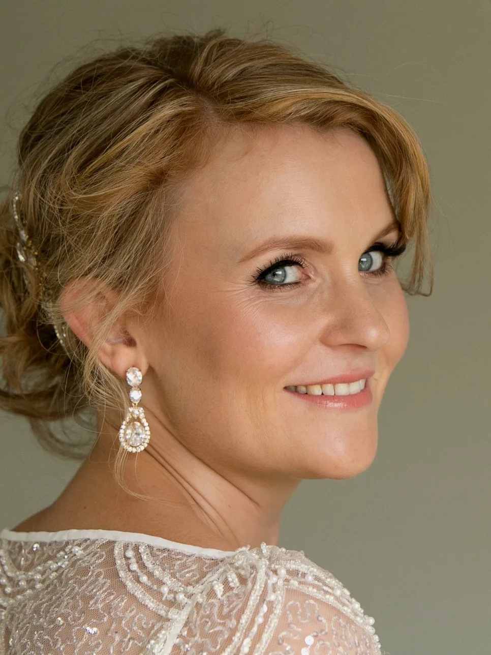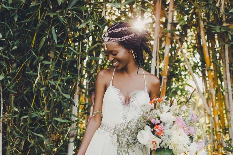 Beautiful Bride with long blonde hair in soft curls holding a Boho style bouquet of flowers