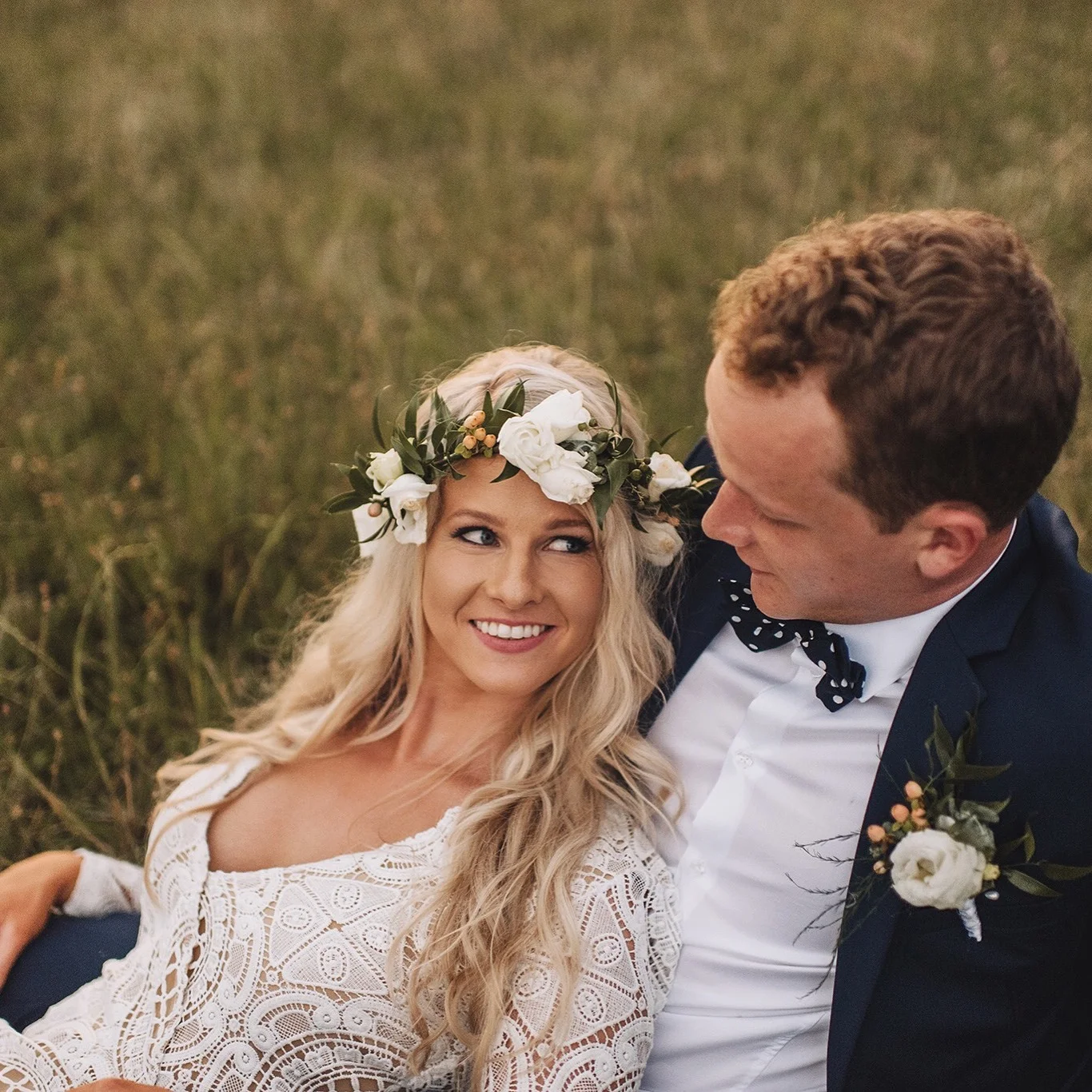Beautiful Bride close up shot of her outdoors in a field at sunset sniffing the flowers in her wild bouquet. She has short blonde hair in boho curls and natural bridal makeup