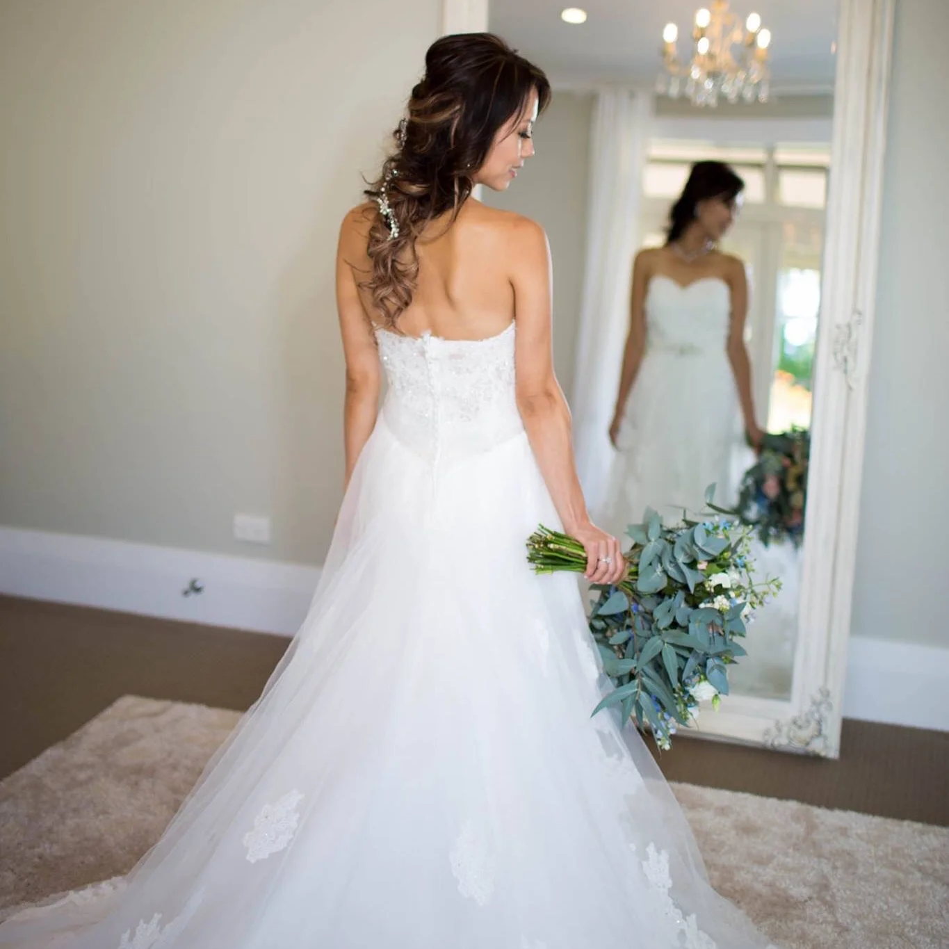 Photo of the Bride and Groom with their backs to the camera. A beautiful Waterfall and Native New Zealand bush surrounds them. The brides hair is long and Blonde with a Boho braid and soft curls